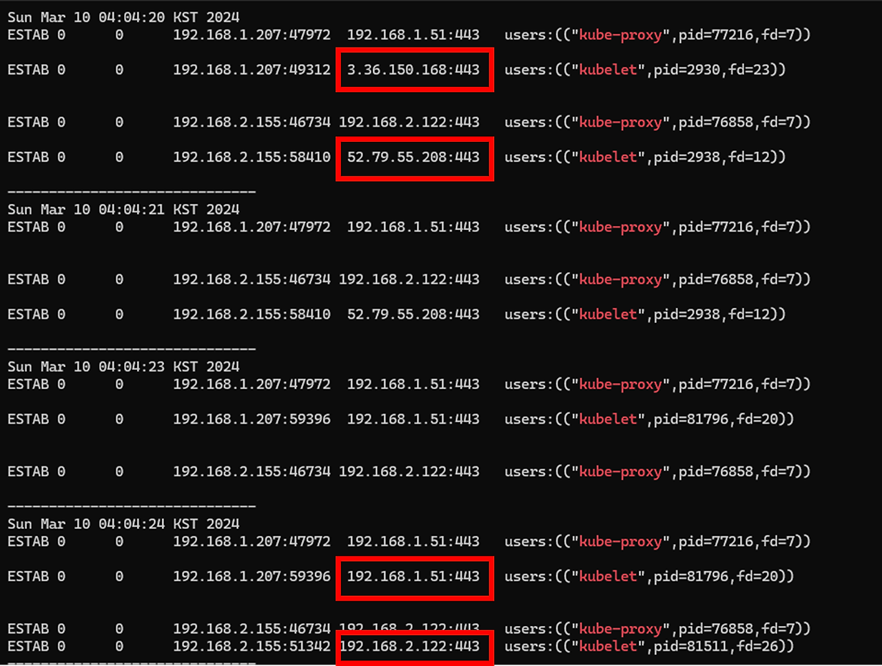 while true; do ssh ec2-user@$N1 sudo ss -tnp | egrep 'kubelet|kube-proxy' ; echo ; ssh ec2-user@$N2 sudo ss -tnp | egrep 'kubelet|kube-proxy' ; echo "------------------------------" ; date; sleep 1; done