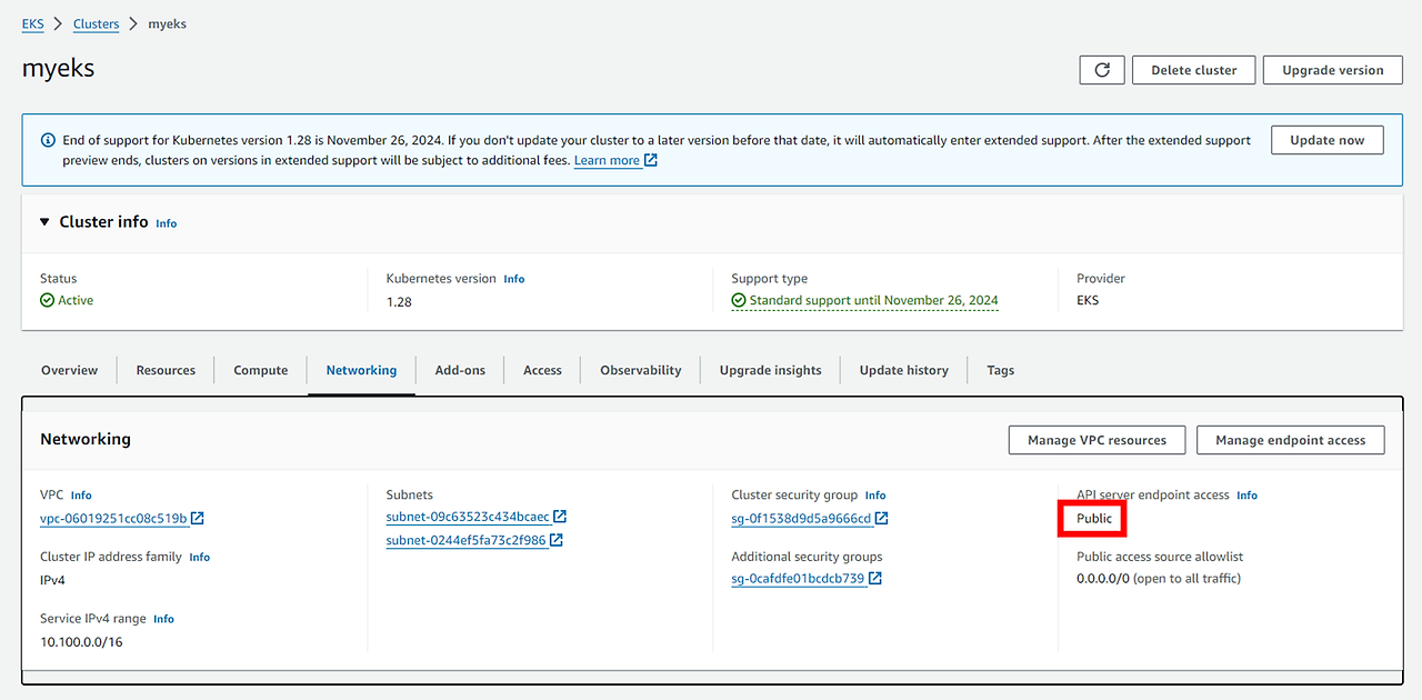 4. Check the created EKS cluster - endpoint access (Public -> Public and private)