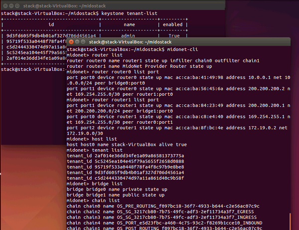 The following figure illustrates my execution of midonet-cli console. Using midonet-cli, I can check tenant lists in OpenStack. Also, I can check lists of logical routers, their ports, hosts, and chains for pre-routing and post-routing for routers.