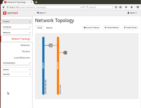 Horizon: by default, 200.200.200.0/24 public network has been created. I created one VM instance.