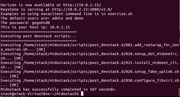After executing those commands, the latest source codes of Midonet, DevStack, and OpenStack components are downloaded, installed, and some basic logical routers used by Midonet will be successfully configured.