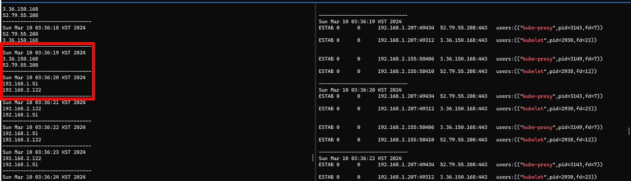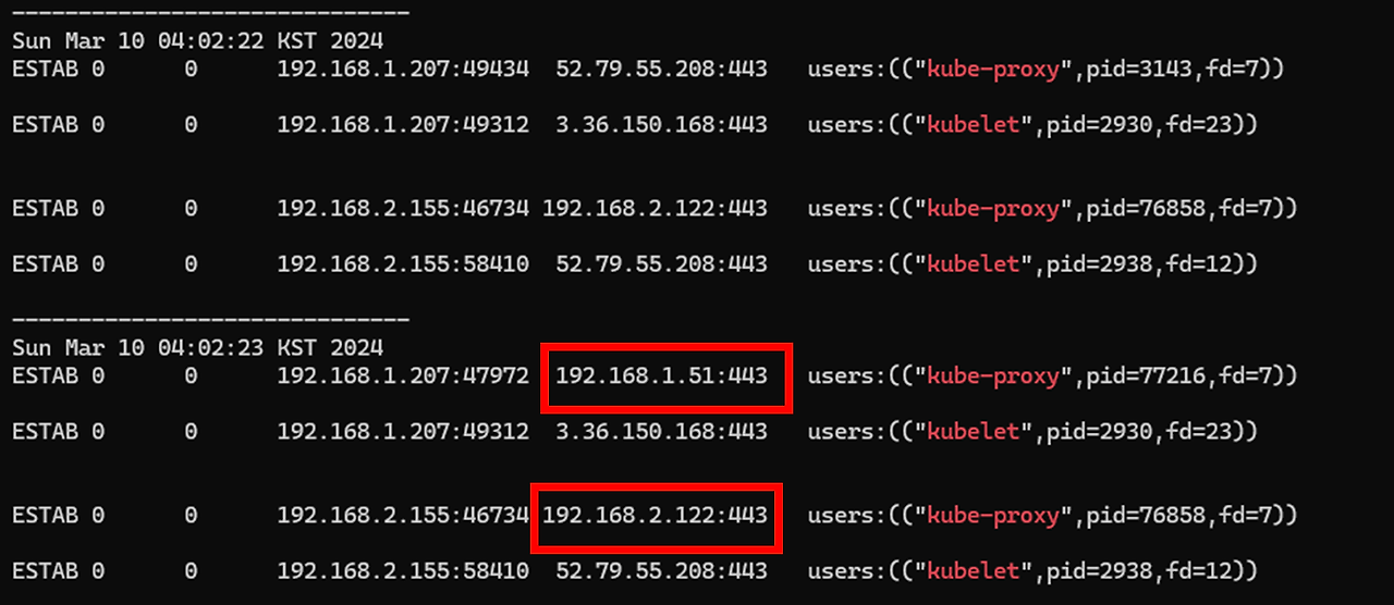 while true; do ssh ec2-user@$N1 sudo ss -tnp | egrep 'kubelet|kube-proxy' ; echo ; ssh ec2-user@$N2 sudo ss -tnp | egrep 'kubelet|kube-proxy' ; echo "------------------------------" ; date; sleep 1; done