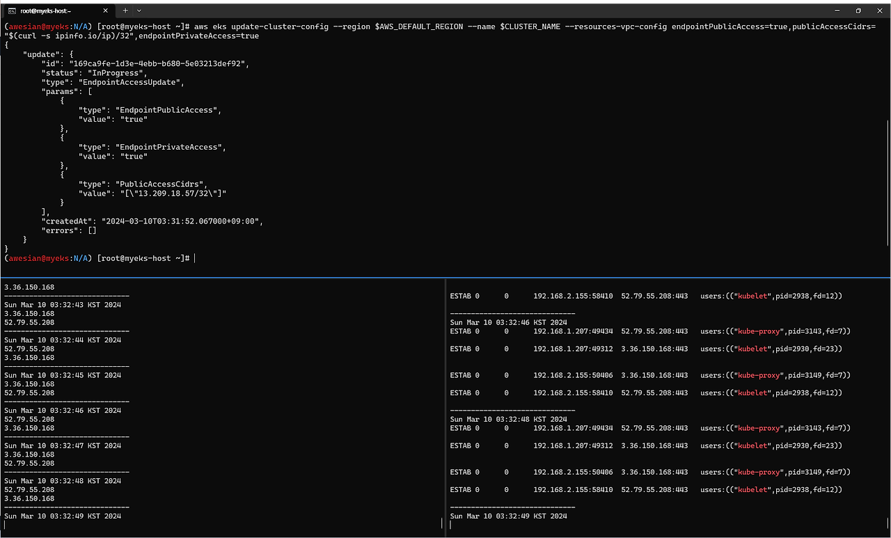 Let's change the API server endpoint access to "Public and Private". To detect changes, we can use a total of three terminals. Two of these terminals will be used for monitoring purposes.