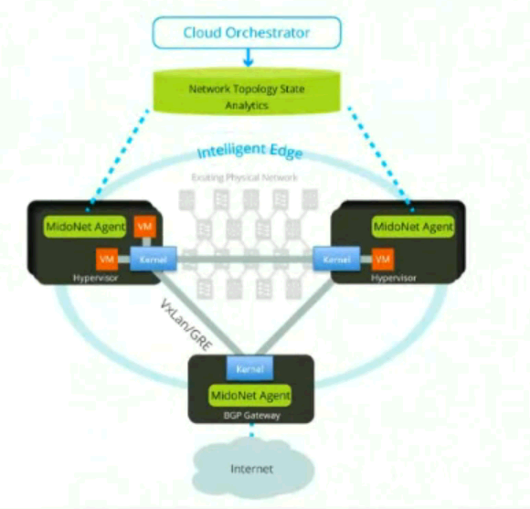 Midonet from Midokura is designed to provide the following network functionalities by placing a network virtualization layer between cloud management platform layer (e.g., OpenStack) and Hypervisor layer (e.g., KVM).